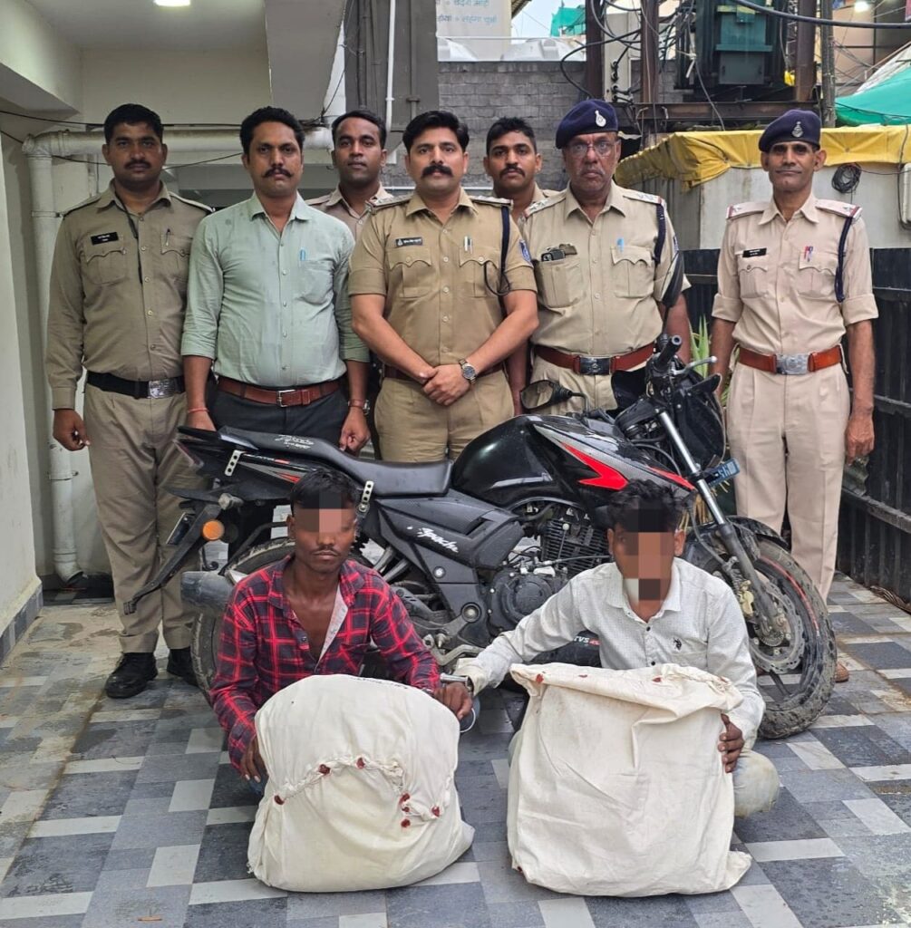 इसी कडी में थाना सराफा की पुलिस टीम को दिनांक 24.06.2025 को थाना सराफा क्षेत्र भ्रमण के दौरान सूनसान जगह पर 02 व्यक्ति दो बोरे व मोटरसाईकल लिए संदिग्ध अवस्था में दिखाई दियें। जिन्हे रोककर पूछताछ करने पर घबराकर भागने का प्रयास करने लगे, जिन्हे पुलिस टीम द्वारा घेराबंदी कर पकडा गया। तथा जिनके पास से दो बोरे (कट्टी) मिले जिसके बारे में पूछने पर आनाकानी कर घबराने लगे जिसकी नियमानुसार तलाशी लेने से अवैध मादक पादार्थ गांजा होना पाया गया। जिसे आरोपियो के पास से विधिवत जप्त किया गया।